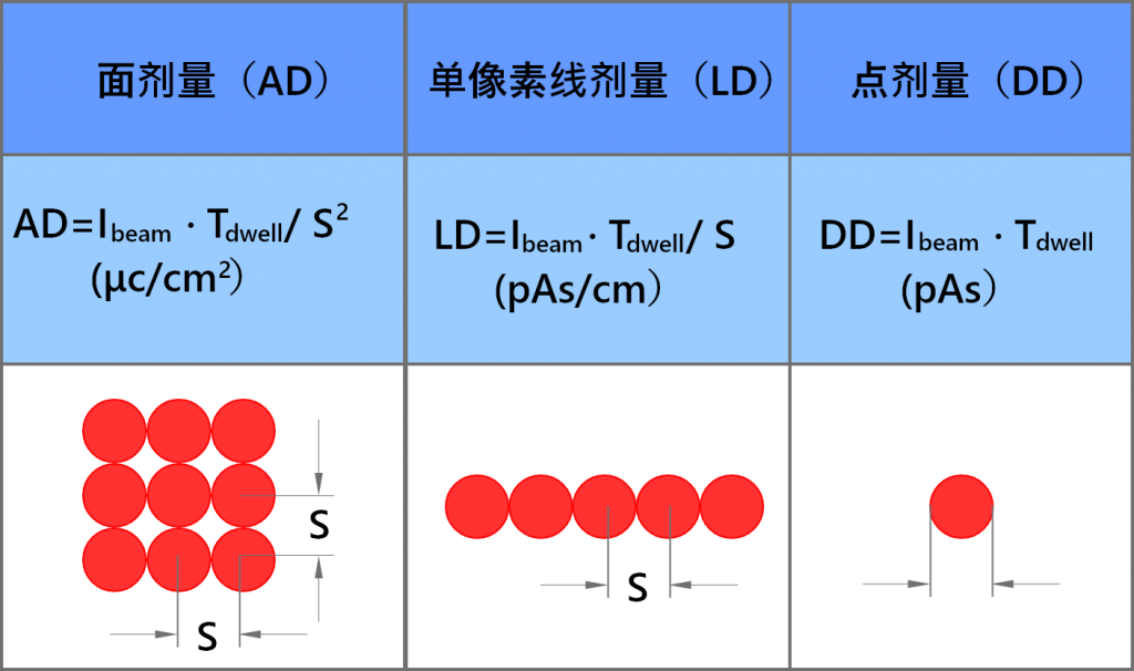 圖2 點(diǎn)、線、面形狀的曝光區(qū)域?qū)?yīng)的劑量計(jì)算公式