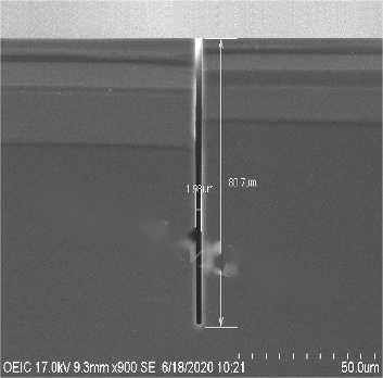 通過對(duì)工藝參數(shù)的優(yōu)化,得到了下圖為2μm線寬刻蝕深度80微米,深寬比達(dá)40:1。